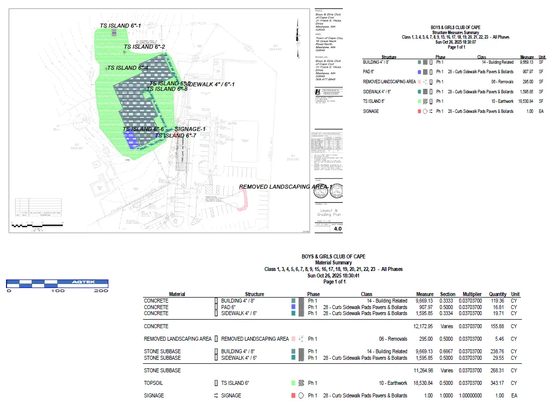 AGTEK Grading File: Detailed earthwork takeoff data, including existing and proposed ground surfaces, subgrades, stripping layers, boundaries, and 3D cut/fill volumes.