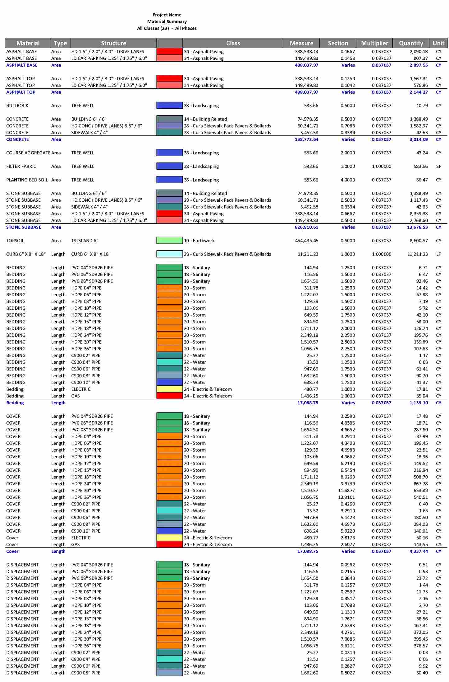 - Type, size and lengths of materials in LF, SF, lbs., CY and EA.
